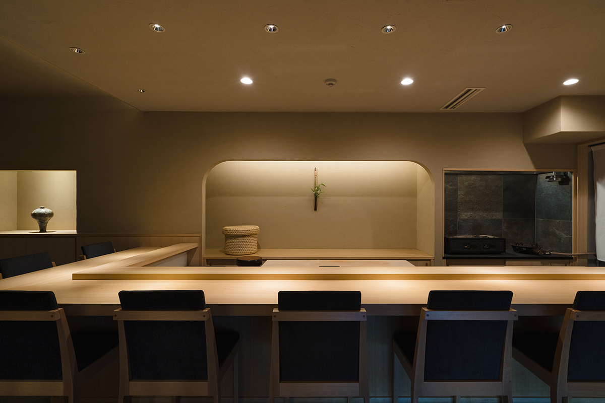 カウンター8席のみのシンプルな鮨店。 アプローチ部分は入り組んだスロープになっており、扉までの少し距離を進む中で気持ちが切り替わる演出をしている。内装は土壁・檜といった自然素材を使用し、装飾的な要素は用いず、間接照明や地窓により立体感や奥行を表現している。シンプルな設えの中に無垢の檜のカウンターを浮かび上がらせ、食に焦点が当たるような空間とした。